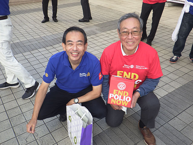 晴天の日曜日、錦糸町駅前広場にて東分区大澤ガバナー補佐をはじめ、東京城東ロータリークラブほか60名のロータリアンが集結し、道行く人々に”ポリオ根絶”を訴えました。
