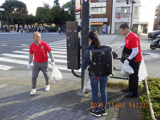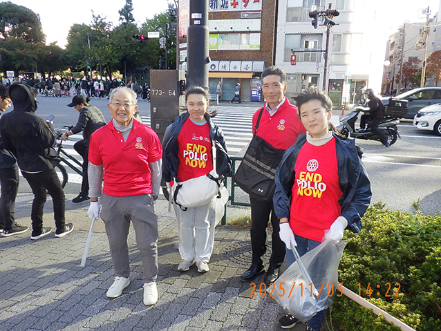 東京城東クラブからは会長、幹事以下8名が参加。150名の参加者は混成して8つのグループに振り分けられ、前半の90分は近隣の公園内の清掃活動、後半の90分は北口、南口の各駅前広場での募金活動を各グループ毎に所定の時間をかけて活動し、時間になれば次の場所へと移動、全員が合計180分(3時間)かけて順次、それぞれの活動を行います。